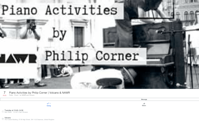 Susan will be involved in a rare performance of Philip Corner’s ‘Piano Interactivities’ at Volcano, High Street, Swansea on Tuesday at 13.45 – 14.30