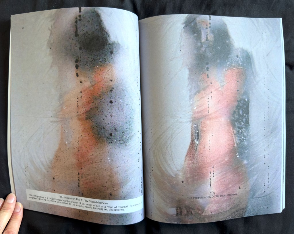 ‘Dis/Integration’ is a project exploring the erosion of our sense of self as a result of traumatic experience, it employs a printing technique which leads to the image gradually distorting and disappearing over time.